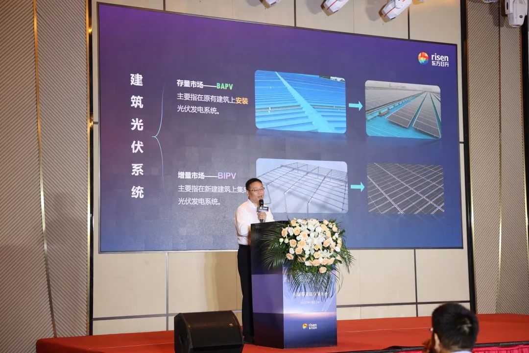 好的市場更需要好的產品。東方日升BIPV總經理廉軍建在隨后的演講中對東方日升超能頂、超能瓦BIPV解決方案優質性進行了深入淺出介紹。深耕建筑光伏領域多年,廉軍建綜合建筑光伏市場產品的市場發展、技術路線、施工制造等方面的講解讓在場觀眾眼前一亮。