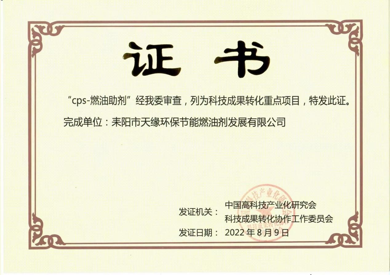 CPS-燃油助劑發明和創造了低碳石油,解決了常規石油尾氣排放問題,開了低碳石油技術的歷史先河,從根本上可以解決因石油尾氣排放因素所造成的空氣污染,是治理霧霾、緩解氣候變化現象的一項最直接、最有效的技術,是發展低碳經濟、實行節能減排國家規劃綱要,是維護中華民族長遠利益的必然要求。技術于2003年9月9日通過省科技成果鑒定,該項技術的成功出現,為我國稠油加工多功能高效助劑領域的空白增添了一筆色彩,該技術在國內燃油助劑研究領域處于領先水平。同年12月又通過了省高科技產品(項目)認定,榮獲2003年省新技術新產品創新金獎,2004年衡陽市科技進步一等獎,省科技進步三等獎。CPS-燃油助劑項目更是被授予“省科技成果重點推廣計劃項目”。2011年10月21日該技術再次通過了國家科技成果鑒定。2016年5月15日完成科學技術評價,中高科評字[2016]第003號,2022年8月列入“科技成果轉化重點項目”。該項目技術經過專家多次的評審分析和可行性研究,技術成熟,產品市場潛力巨大,經濟社會效益明顯,是一項節能減排的重大科技成果項目。它發明和創造了清潔低碳石油,為人類造福,還人類一個美好的清新自然的生活環境,是實現低碳石油應用最有效的一項科學技術。