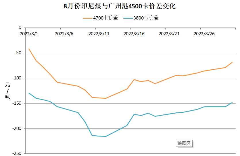 由于近期印尼煤到岸價持續(xù)反彈,而北方港內(nèi)貿(mào)煤價格雖也有上漲,但由于運(yùn)費(fèi)的下跌,抵消了煤價部分漲幅,因此導(dǎo)致印尼煤價格與內(nèi)貿(mào)煤價格的價差優(yōu)勢逐漸縮小。截至8月30日,印尼3800卡與廣州港內(nèi)貿(mào)4500卡價差最新已降至150元/噸,4700卡價差降至68元/噸。
