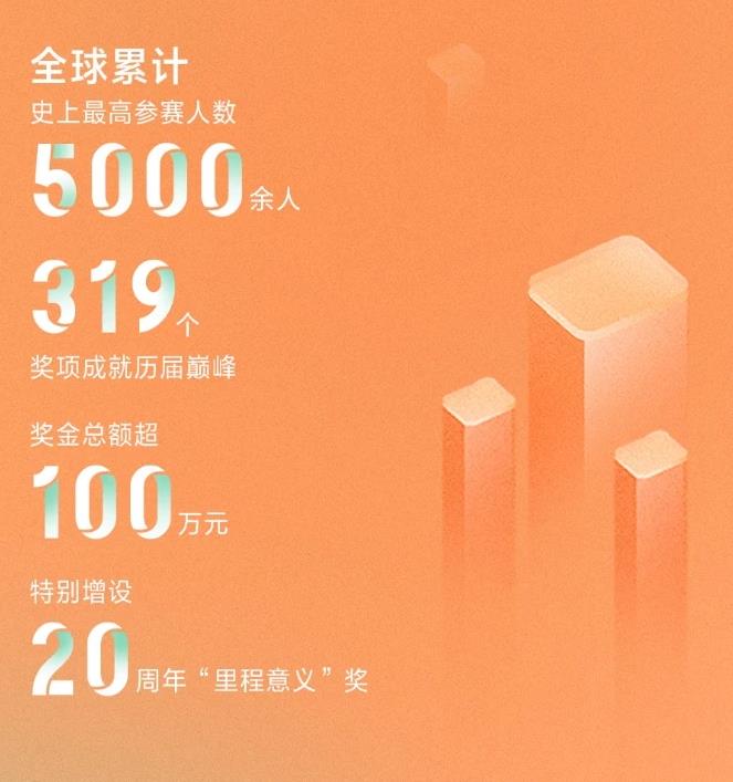 據了解,大賽自4月啟動以來,經過4-7月的深入推廣宣傳,參賽人數達5000余人創史上新高,設319個獎項成歷屆巔峰,超100萬元獎金總額刷新過往,共收到參賽作品1000余份打破預期。為紀念MDV大賽“年滿20歲”,大賽還特別增設20屆限定獎項——里程意義獎,以表彰20年來為MDV不斷成長與發展做出突出貢獻的單位或個人。