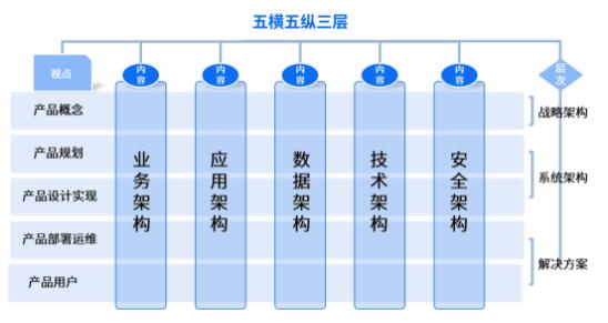 五縱,即縱向包括的五大架構設計——業務架構、應用架構、數據架構、技術架構、安全架構。