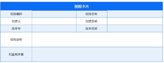 視圖卡片是關于視圖元信息的描述,通過視圖卡片可以了解視圖編碼、名稱、版本號、創建人、視圖描述和視圖的利益相關者。