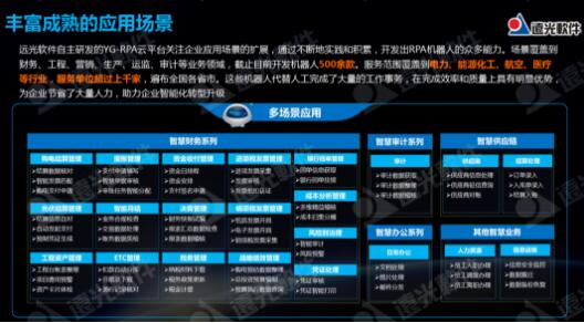 遠(yuǎn)光軟件基于YG-RPA云平臺(tái)已經(jīng)成功打造出數(shù)百款RPA機(jī)器人,應(yīng)用場(chǎng)景覆蓋到財(cái)務(wù)、工程、營(yíng)銷(xiāo)、生產(chǎn)、運(yùn)監(jiān)、審計(jì)等業(yè)務(wù)領(lǐng)域,涉及行業(yè)囊括電力、能源化工、航空、醫(yī)療等,服務(wù)單位遍布全國(guó)各省市超過(guò)上千家,為企業(yè)節(jié)省了大量人力,推動(dòng)企業(yè)管理變革和業(yè)務(wù)創(chuàng)新。