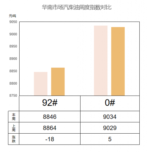 華南主營汽跌柴穩。近期主營單位多挺價,價格穩中小幅下降;柴油現貨依舊偏緊,主營單位控量銷售,保供終端及加油站為主。