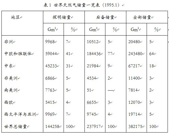 表1給出了各地區(qū)已探明天然氣儲量、后備儲量以及總儲量。探明的最大天然氣儲量地區(qū)是俄羅斯和海灣地區(qū)。據(jù)測算該兩地區(qū)已探明的天然氣儲量約為全球天然氣儲量的83%。