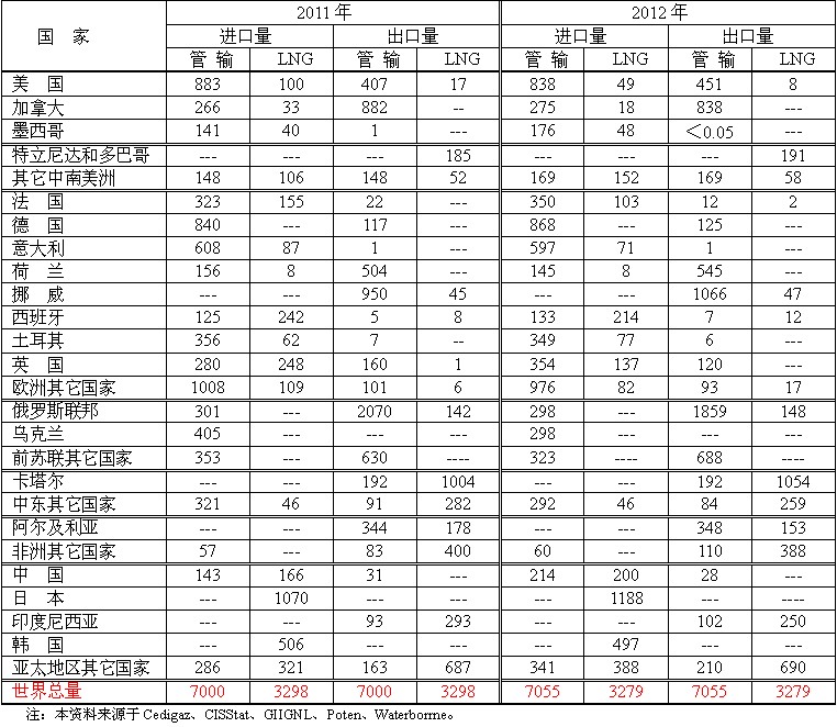 2012年管輸進口最多的國家是德國,進口量達868億立方米,占世界總量的12.3%,其次美國,進口達838億立方米,占世界總量的11.9%;而中國管道進口只有214億立方米。液化天然氣進口最多的國家是日本(1188億立方米)、韓國(497億立方米)和西班牙(214億立方米),而中國為200億立方米。
