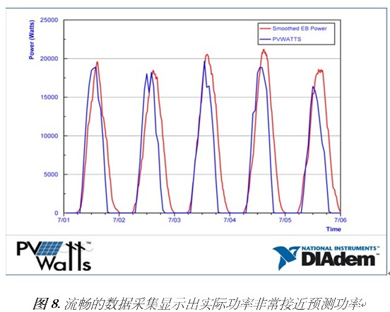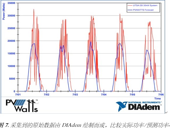 有些分析任務(wù)使用的是DIAdem軟件,可用于后續(xù)處理數(shù)據(jù)分析。DIAdem可協(xié)助UTSA的教授針對(duì)采集過(guò)程中的信號(hào)來(lái)處理相關(guān)問(wèn)題,進(jìn)一步分析并呈現(xiàn)數(shù)據(jù)。這些分析已用于執(zhí)行太陽(yáng)能預(yù)測(cè)比較。下圖為實(shí)際的太陽(yáng)能光電(PV)輸出與預(yù)測(cè)的PV輸出之間的比較。