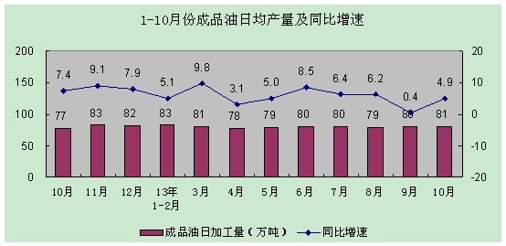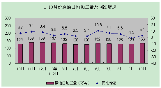 10月份原油加工量4108萬噸,同比增長3.1%;成品油產(chǎn)量2524萬噸,同比增長4.9%;乙烯產(chǎn)量149萬噸,同比增長16.8%;合成樹脂產(chǎn)量508萬噸,同比增長15.7%;合成橡膠產(chǎn)量39萬噸,同比增長13.4%;化肥產(chǎn)量671萬噸,同比增長5.3%。