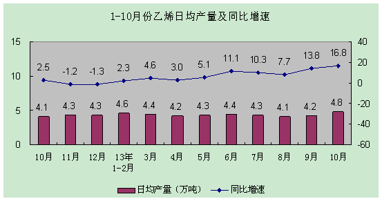 產(chǎn)量。1-10月份,主要石化產(chǎn)品產(chǎn)量穩(wěn)步增長。原油加工量39687萬噸、成品油產(chǎn)量24530萬噸、乙烯產(chǎn)量1325萬噸,同比增長4.1%、5.2%、7.3%;合成樹脂產(chǎn)量4793萬噸、合成橡膠產(chǎn)量339萬噸,同比增長10.6%、6.5%;化肥產(chǎn)量6717萬噸(折純,下同),同比增長7.1%。