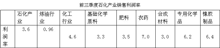 今年以來石化產(chǎn)業(yè)經(jīng)營情況總體向好,但盈利能力仍較弱,產(chǎn)業(yè)整體銷售利潤率3.6%,其中煉油行業(yè)銷售利潤率僅0.96%。從各行業(yè)銷售利潤率看,農(nóng)藥、橡膠制品、專用化學(xué)品盈利能力較強,基礎(chǔ)化學(xué)原料、合成材料、肥料盈利能力相對較弱。