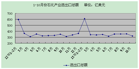 對外貿(mào)易。1-10月份,石化產(chǎn)業(yè)進(jìn)出口貿(mào)易總額約3346億美元,同比增長2.3%。進(jìn)口額約1885億美元,同比增長約0.6%;出口額1462億美元,同比增長4.5%;全行業(yè)貿(mào)易逆差約423億美元。大宗進(jìn)口產(chǎn)品中,有機化學(xué)品和合成樹脂進(jìn)口額分別為451億和414億美元,同比增長15.1%和2.9%。無機化學(xué)品、合成橡膠進(jìn)口額分別為74.8億和36.9億美元,同比下降0.5%和15.3%。合成纖維單體進(jìn)口額118億美元,同比下降19.3%,其中對苯二甲酸(PTA)、己內(nèi)酰胺等重要單體降幅在40%以上。單月看,10月份進(jìn)出口貿(mào)易總額320億美元,同比增長2.1%。進(jìn)口額174億美元,同比下降3.3%;出口額146億美元,同比增長9.5%。