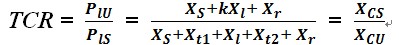 1)在送、受端系統(tǒng)不變的情況下,同一條輸電線路在1000千伏運行時的輸電容量PlU與500千伏運行時的輸電容量PlS之比TCR為: