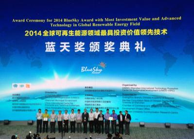 2014年度全球可再生能源領域最具投資價值的領先技術藍天獎(BA),昨天在國際低碳城揭曉。"藍天獎"候選技術涵蓋太陽能、風能、地熱能、海洋能、生物質能等可再生能源領域。