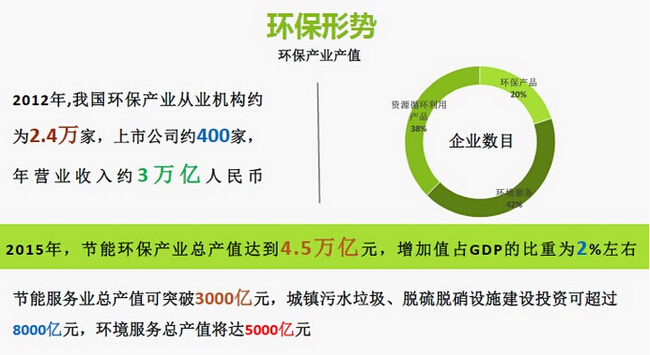 從2012年環保產業調研報告可以看出,環保產業形勢卻呈現出了逐漸增大的發展勢頭,2012年環保產業年營業收入達到3萬億人民幣,到2015年預計將突破4.5萬億;其中,由于國家極力促進環境服務業的發展,節能服務業總產值有望突破3000億元。伴隨著公眾對環境感知的提升,政府對環境的重視逐漸增加,政府對產業內的關注包括《氣十條》、《水十條》也都在促進著目前的環保形式,預計將拉動投資超過萬億。