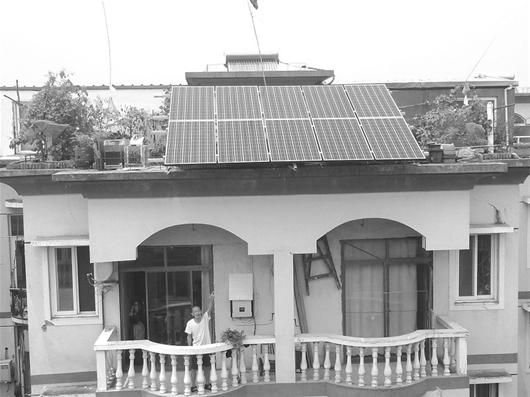 7月9日,記者來到玉龍島花園詹才翰老人家。一進入這位76歲老人的家門,看到五六十平方米的房子還是毛坯,沒有裝修,家中擺設也異常簡陋。不過,客廳里一個酷似小冰箱的柜子卻分外顯眼——這是用于光伏發電的蓄電池。而在其家屋頂上,“屹立”著十塊光伏板。