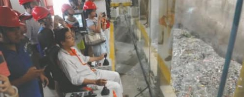 “哎呀,好臭好熱!”剛步入車間,體驗(yàn)團(tuán)代表們立刻感受到了“兩重天”。原來整個(gè)車間就是一個(gè)大的“垃圾房”,這里已經(jīng)容納了2萬余噸的垃圾。只見廠房?jī)?nèi)三臺(tái)焚燒爐正在燃燒,兩臺(tái)吊車正在緊張作業(yè),將位于底部的堆成山的生活垃圾提抓至爐中,通過焚燒轉(zhuǎn)化為電能。