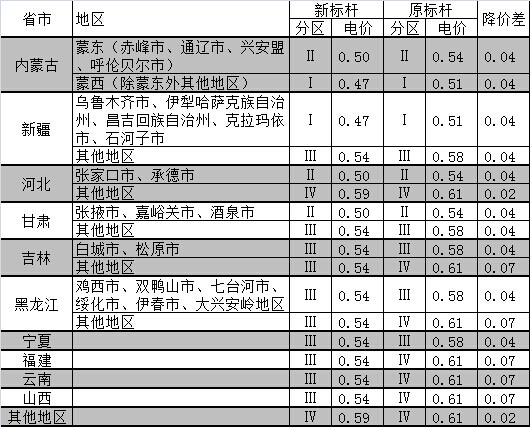 上述五省及部分地區降幅更大。其中,福建、云南、山西下降幅度為8.5%;吉林、黑龍江下降幅度則分地區有所不同,其中,吉林省白城市、松原市,黑龍江省雞西市、雙鴨山市、七臺河市、綏芬河市、宜春市、大興安嶺地區從0.58元/千瓦時下降至0.54元/千瓦時,降幅6.9%,其余地區電價從0.61元/千瓦時下降至0.54元/千瓦時,降幅高達11.5%。