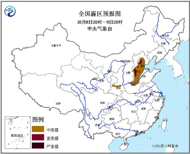 中央氣象臺10月9日06時繼續發布霾黃色預警:預計9日08時至10日08時,北京大部、天津、河北中南部、山東西部、河南中北部、山西南部及陜西關中等地的部分地區有中度霾,其中北京中東部、河北西部沿山局地有重度霾。另外,9日上午,華北中南部、河南西北部、陜西北部和關中等地的部分地區有能見度不足1公里的大霧。