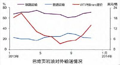 巴肯頁巖區(qū)帶2013年的頁巖油產(chǎn)量約為97.5萬桶/日,年度平均產(chǎn)量較2012年大幅增長32%,仍是全球頁巖油產(chǎn)量最高的區(qū)帶之一。鐵路運(yùn)輸盡管費(fèi)用較高,但在巴肯頁巖油外輸方面仍起到重要作用(見圖)。該區(qū)頁巖油通過管道輸往的原油集散地庫欣(Cushing)地區(qū)庫存積壓,導(dǎo)致WTI價格長期低于布倫特原油(Brent)價格,石油公司寧愿支付較高鐵路運(yùn)費(fèi),將頁巖油運(yùn)往沿海地區(qū)參照布倫特原油價格銷售從中獲得較高利潤。