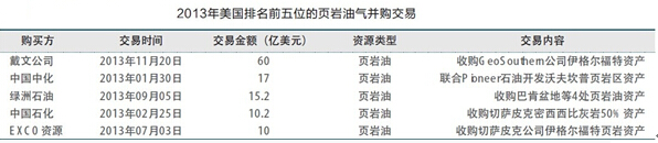 2013年,美國頁巖油氣資源并購交易總數(shù)為108宗,總金額超過230億美元;頁巖油相關(guān)并購交易數(shù)量為77宗,交易金額超過190億美元;頁巖氣相關(guān)并購交易數(shù)量為31宗,交易金額約40億美元。其中,戴文公司60億美元并購伊格爾福特頁巖油資產(chǎn)成為當(dāng)年最大金額交易,綠洲(Oasis)石油公司出資15.2億美元并購巴肯頁巖區(qū)帶等資產(chǎn),中國中化出資17億美元參與沃夫坎普頁巖區(qū)帶勘探開發(fā)也是2013年規(guī)模較大的并購活動。