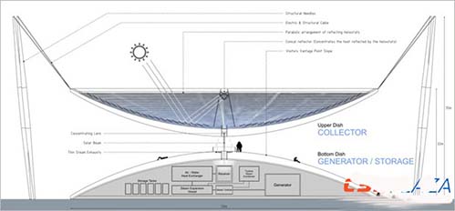 根據這項方案,一系列的定日鏡被安裝在沙漏上表面,定日鏡反射陽光將太陽光聚焦到一個錐形的二次反射鏡上,這個二次反射鏡再將光通過沙漏漏斗反射至沙漏底部的集熱器上,集熱器、儲熱設施以及發電系統都被置于下層沙漏的表面內部,從外觀上來看你完全難以猜到里面竟然安裝了儲熱和發電系統。
