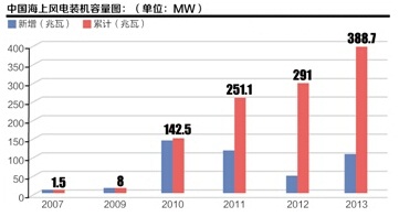 按照規劃,截至2015年底,中國將建成海上風電500萬千瓦,但直至2013年底僅僅完成裝機容量近39萬千瓦,不足規劃目標的1/10,2014年的統計結果暫未出爐。