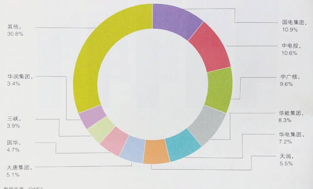 2013年,風(fēng)電新增裝機(jī)中,國電集團(tuán)(含龍?jiān)?繼續(xù)保持其領(lǐng)先地位,裝機(jī)容量達(dá)到了1751.1MW,(其中龍?jiān)礊?055.1MW),占新增裝機(jī)總量的10.9%;中電投以1712.2MW的裝機(jī)量緊隨其后,中國廣核集團(tuán)以1536.65MW的裝機(jī)容量排名第三。市場份額分別占到10.6%和9.6%。