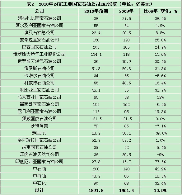 根據(jù)調(diào)查結(jié)果,2010年投資額在10億美元以上的24家國家石油公司油氣E&P投資大約1892億美元(表2),同比增長14%。2010年,阿爾及利亞、挪威和委內(nèi)瑞拉等3家國家石油公司E&P投資將與2009年基本持平;泰國PTT、沙特阿美、印度石油天然氣公司和卡塔爾、墨西哥與越南等6家國家石油公司E&P投資同比將下降5-10%,其中泰國PTT公司下降幅度將高達39.6%;亞洲、非洲、俄羅斯及其他地區(qū)的15家國家石油公司E&P投資增幅均在兩位數(shù)以上,其中,印尼國家石油公司投資增幅最高,達77.3%,中石油、阿布扎比國家石油公司、中石化、利比亞國家石油公司和俄氣石油公司的投資增幅將分別達到42.9%、38.2%、32.4%、31.7%和30.4%。