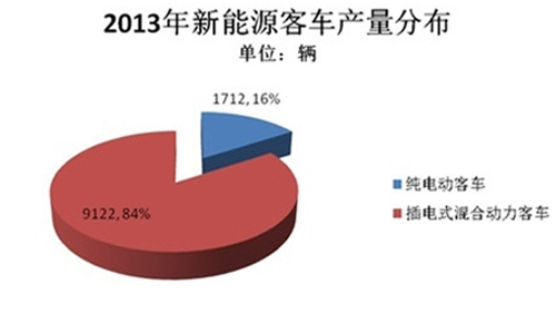 2014年,中國新能源客車產量為26217輛,比上一年增長1.42倍,2014年的產量超過了此前幾年生產的新能源客車總和。其中純電動客車12904輛,比上一年增長6.54倍,插電式混合動力客車13313輛,比上一年增長8.93倍,傳統混合動力客車1193輛,比上一年減少86%。由于傳統混合動力汽車被排除在新能源汽車之外,混合動力客車產量也大幅萎縮,2014年的新能源客車的統計數據也沒有包括傳統混合動力客車。