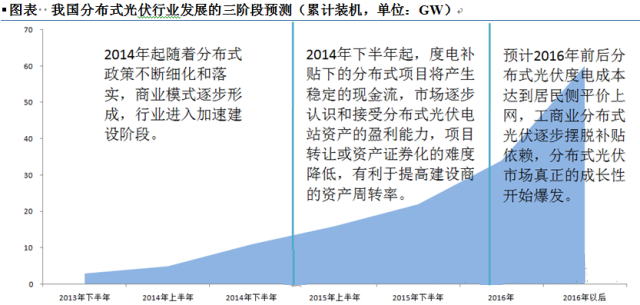 從14年年底到15年年初行業發生的一些變化來看,個人認為分布式光伏行業應該處于第一階段發展過程中(建設加速),并逐步進入第二階段(融資口逐步放開)。
