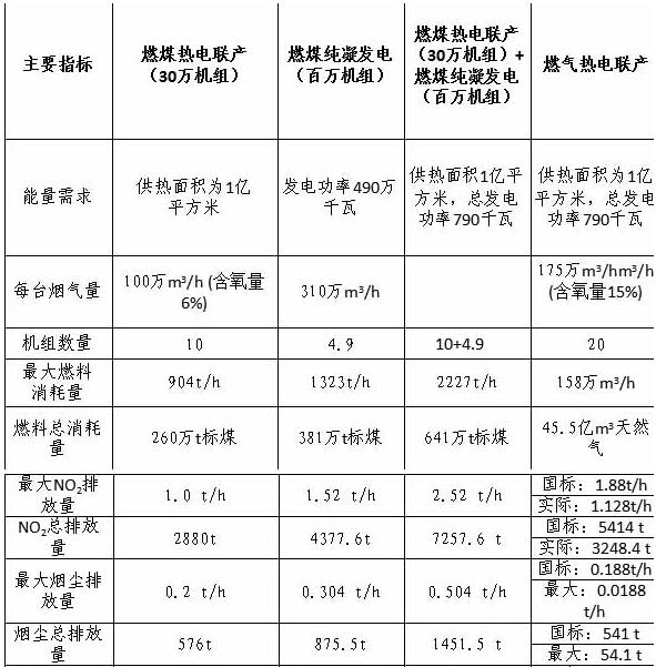 依據(jù)國(guó)標(biāo)GB13223-2011《火電廠大氣污染物排放標(biāo)準(zhǔn)》中關(guān)于重點(diǎn)地區(qū)大氣污染物排放特別限值之規(guī)定,分單獨(dú)考慮供熱需求及綜合考慮供熱、供電需求兩種情況對(duì)燃煤熱電聯(lián)產(chǎn)、燃?xì)鉄犭娐?lián)產(chǎn)在同等條件下的大氣污染物排放進(jìn)行了計(jì)算,計(jì)算周期為一個(gè)供熱周期(4×30天),供熱面積1億平方米。