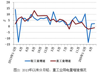 1-5月份,全國工業(yè)用電量15452億千瓦時,同比下降0.8%,增速同比降低5.7個百分點,占全社會用電量的比重為70.6%,對全社會用電量增長的貢獻率為-51.9%。其中,輕、重工業(yè)用電量分別為2598和12853億千瓦時,同比分別增長2.0%和下降1.3%,增速同比分別降低2.6和6.4個百分點。