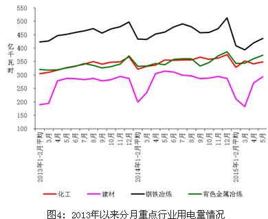 1-5月份,化學原料制品、非金屬礦物制品、黑色金屬冶煉和有色金屬冶煉四大高載能行業(yè)用電量合計6699億千瓦時,同比下降 1.7%,增速同比回落6.0個百分點;合計用電量占全社會用電量的比重為30.6%,對全社會用電量增長的貢獻率為-49.5%。其中,化工行業(yè)用電量1697億千瓦時,同比增長1.6%,增速同比回落3.2個百分點;建材行業(yè)用電量1170億千瓦時,同比下降6.6%,增速同比回落16.2個百分點;黑色金屬冶煉行業(yè)用電量2069億千瓦時,同比下降6.5%,增速同比回落7.8個百分點;有色金屬冶煉行業(yè)1763億千瓦時,同比增長5.0%,增速同比提高0.9個百分點。
