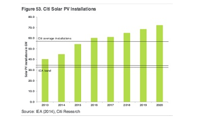 根據花旗銀行的最新報告,2013-2020年全球每年需要安裝53吉瓦太陽能光伏來應對危險的氣候變化。