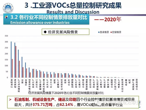 研究結(jié)果表明,在經(jīng)濟(jì)發(fā)展基準(zhǔn)情景下,我國2020年、2030年工業(yè)源VOCs控制總量分別為1790.27萬噸、1822.36萬噸,相較于基準(zhǔn)年2010年排放量分別增長28.75%、31.06%。建筑裝飾、機(jī)械設(shè)備生產(chǎn)、石油煉制以及儲運(yùn)等行業(yè)為VOCs排放的重點(diǎn)行業(yè)。