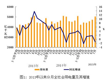 1-7月份,全國(guó)電力供需總體寬松。全社會(huì)用電量當(dāng)月同比下降,三產(chǎn)用電量增速小幅回落。工業(yè)用電量同比負(fù)增長(zhǎng),輕工業(yè)用電量增速明顯回落。高耗能行業(yè)用電量持續(xù)不振,鋼鐵、建材用電量繼續(xù)下滑。發(fā)電裝機(jī)容量保持較快增長(zhǎng),水電當(dāng)月發(fā)電量同比增速轉(zhuǎn)負(fù)。發(fā)電利用小時(shí)同比降幅擴(kuò)大,九成省份火電利用小時(shí)同比下降。跨區(qū)輸送電量增速繼續(xù)回落,跨省輸送電量同比負(fù)增長(zhǎng)。基建新增裝機(jī)規(guī)模同比增加,電源新開工規(guī)模提速。一、全社會(huì)用電量當(dāng)月同比下降,三產(chǎn)用電量增速小幅回落