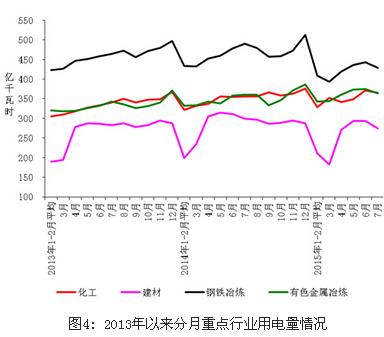 1-7月份,化學(xué)原料制品、非金屬礦物制品、黑色金屬冶煉、有色金屬冶煉四大高載能行業(yè)用電量合計(jì)9624億千瓦時(shí),同比下降 2.0%,增速同比回落6.7個(gè)百分點(diǎn);合計(jì)用電量占全社會(huì)用電量的比重為30.4%,對(duì)全社會(huì)用電量增長(zhǎng)的貢獻(xiàn)率為-74.2%。其中,化工行業(yè)用電量2435億千瓦時(shí),同比增長(zhǎng)2.3%,增速同比回落2.9個(gè)百分點(diǎn);建材行業(yè)用電量1738億千瓦時(shí),同比下降6.7%,增速同比回落15.4個(gè)百分點(diǎn);黑色金屬冶煉行業(yè)用電量2943億千瓦時(shí),同比下降7.4%;增速同比回落9.6個(gè)百分點(diǎn);有色金屬冶煉行業(yè)2508億千瓦時(shí),同比增長(zhǎng)4.6%,增速與去年持平。