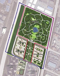 公園南側(cè)規(guī)劃林陰步道,土壤修復(fù)后在公園中心規(guī)劃景觀水面,水面北側(cè)草坪上設(shè)置雕塑群。其他區(qū)域規(guī)劃為生態(tài)林地,打造更舒適、更宜居、更好的城市環(huán)境。