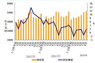 分產(chǎn)業(yè)看,1-8月份,第一產(chǎn)業(yè)用電量704億千瓦時,同比增長2.3%,占全社會用電量的比重為1.9%;第二產(chǎn)業(yè)用電量26431億千瓦時,同比下降0.7%,占全社會用電量的比重為71.9%,對全社會用電量增長的貢獻率為-54.3%;第三產(chǎn)業(yè)用電量4756億千瓦時,同比增長7.5%,增速同比提高1.7個百分點,用電量占全社會用電量的比重為12.9%,對全社會用電量增長的貢獻率為93.6%;城鄉(xiāng)居民生活用電量4890億千瓦時,同比增長4.3%,增速同比提高0.5個百分點,占全社會用電量的比重為13.3%,對全社會用電量增長的貢獻率為56.2%。