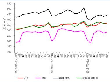 1-8月份,化學原料制品、非金屬礦物制品、黑色金屬冶煉、有色金屬冶煉四大高載能行業(yè)用電量合計11073億千瓦時,同比下降 2.1%,增速同比回落6.6個百分點;合計用電量占全社會用電量的比重為30.1%,對全社會用電量增長的貢獻率為-68.0%。其中,化工行業(yè)用電量2807億千瓦時,同比增長2.5%,增速同比回落2.4個百分點;建材行業(yè)用電量2022億千瓦時,同比下降6.4%,增速同比回落14.2個百分點;黑色金屬冶煉行業(yè)用電量3370億千瓦時,同比下降7.9%;增速同比回落9.9個百分點;有色金屬冶煉行業(yè)2875億千瓦時,同比增長4.2%,增速同比回落0.7個百分點。