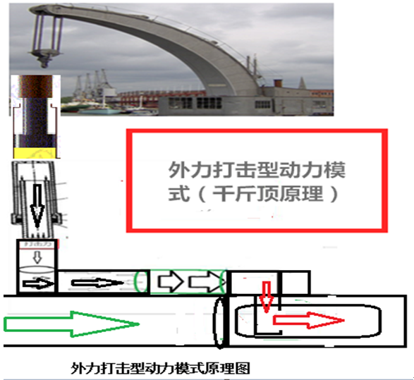 上圖的外力打擊動力模式圖示,是一擊而空模式,它的作用原理其實還是內外環境的壓力差問題,外力打擊動力模式,使一切困難變得容易。一擊而空,可以做到需要多少力,便給多少力,供應遠遠大于需求,這對于外力打擊動力模式來說,并不是不可思議的事。當然,大家都知道了,海底100米處的水壓有多大嗎?每平米至少100噸。從理論上說,確實是對的。但是根據同樣水深的水壓相等規律,即使水壓再大,內外環境的壓力大致相等,基本抵消掉了。為什么有些魚類可以在海底幾千米的深處自由游泳而無任何問題呢?這就說明了一個內外環境的平衡問題,事實上由于抵消的原因,幾乎不存在這個貌似泰山壓頂的問題,或者根本不像網友想象得這么嚴重,這只不過是一個壓力差的問題。當水庫滿水時,根據同等水深壓強相等原理,內外壓差其實是平衡的。退一步說,即使沒有內外平衡抵消的存在,區區100噸,在一擊而空模式面前,也根本不算什么的。目前世界上已經存在的最大起重機已經達到輕松提起4000噸的重量,是我國產的。大家自己算一算,莫說100噸,即使是1000噸,都可迎刃而解,又算什么呢?