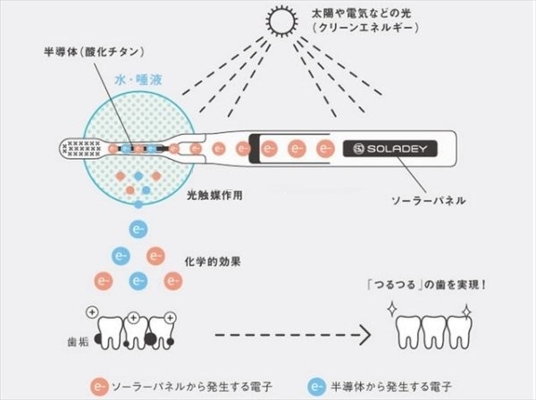 SOLADEY N4太陽能牙刷上面設有一塊太陽能電池板,而牙刷柄之間藏有一種氧化鈦(TiO)物質,當牙刷使用的時候,牙刷所吸收的光再加上水或口水便會與氧化鈦發生化學反應,產生一些列負電子,這些負電子就能有效地去除牙漬。