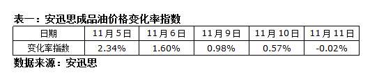 ICIS安迅思2015年11月12日訊——本輪調(diào)價周期內(nèi),國際原油價格反彈帶動成品油價格變化率以正值開盤;而隨著俄羅斯原油產(chǎn)量創(chuàng)記錄,美國原油庫存持續(xù)增長等因素出現(xiàn),國際原油轉(zhuǎn)而下滑,成品油價格變化率逐漸縮窄并轉(zhuǎn)為負(fù)數(shù)。安迅思監(jiān)測數(shù)據(jù)顯示,11月11日,安迅思成品油價格變化率指數(shù)為-0.02%,國內(nèi)汽柴油零售下調(diào)幅度約5元/噸。