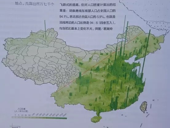 胡煥庸線,又稱黑河-騰沖線,線東南方36%國土居住著96%人口(根據(jù)2000年第五次全國人口普查資料,按胡煥庸線東南半壁占全國國土面積43.8%、總?cè)丝?4.1%)