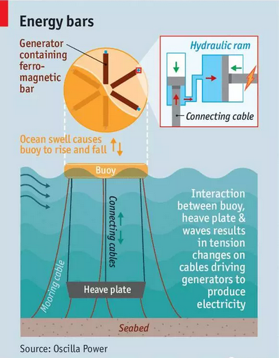 振蕩發(fā)電機有兩個大部件組成,這兩個大部件被纜繩連接在一起。在纜繩的一端,振蕩發(fā)電機漂浮在水面上,在浮標內(nèi)有發(fā)電用的合金棒、磁體、線圈和多套擠壓合金棒的液壓油缸;在纜繩的另一端,吊著一個垂蕩板結(jié)構(gòu),垂蕩板在慣性和周圍海水的拖動下,能保持浮標的穩(wěn)定。這種結(jié)構(gòu)讓浮標在海面隨著海浪上下起伏,而垂蕩板卻大概保持在原來位置,將拉力施加給纜繩。由于拉力的變化,纜繩帶動液壓油缸運轉(zhuǎn)。整套系統(tǒng)由第二套系在海床上的纜繩固定在特定位置上。