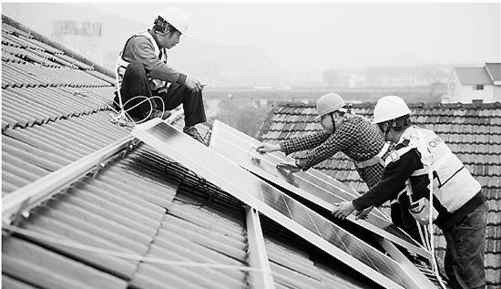 昨天,桐廬縣江南鎮(zhèn)荻浦村申屠長慶家的屋頂上,3名來自浙江正泰電器股份有限公司的工作人員,正在忙著安裝太陽能光伏電池板。
