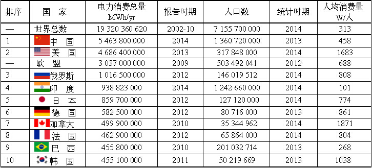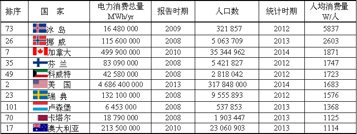 根據美國中央情報局《世界統計年鑒》報道的各國電力消費。中國人均電力消費量高于世界平均水平,但美國比中國高出3倍半(見表2)。人均電力消費最多的國家是冰島、挪威和加拿大(見表3)。表中“排序”是按照電力消費總量排序的。