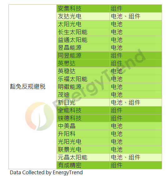 本次公告結果與2015年12月22日歐盟委員會所公告的《一般揭露文件》內容相同,共有21間臺灣太陽能電池、組件廠豁免于反規避稅的限制。根據EnergyTrend先前的了解,臺灣大部分能見度高的廠商皆列豁免清單;未被豁免者,其中部分已停止生產業務,其他如太極能源等,已在海外擁有足夠產能供應歐洲需求,因此也不受影響。