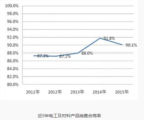 抽查了24種2829家企業(yè)生產(chǎn)的2845批次產(chǎn)品,抽查合格率為90.1%,比2014年下降了1.7個(gè)百分點(diǎn)。其中,墻壁開(kāi)關(guān)、稀土氧化物2種產(chǎn)品的抽查合格率為100%;架空絕緣電纜、永磁直流電動(dòng)機(jī)、橡套電纜、電動(dòng)工具、電力電纜、鎂碳磚、鋼絲繩7種產(chǎn)品抽查合格率均高于90%;數(shù)據(jù)纜、電池、家用和類(lèi)似用途剩余電流動(dòng)作斷路器、家用和類(lèi)似用途插頭插座、非金屬密封板、小型斷路器、動(dòng)力用煤、砂輪、三相異步電動(dòng)機(jī)、復(fù)合外套無(wú)間隙金屬氧化物避雷器10種產(chǎn)品的抽查合格率在80%和90%之間;海水及苦咸水利用膜、器具開(kāi)關(guān)、移動(dòng)式插座、光伏并網(wǎng)逆變器、電力變壓器5種產(chǎn)品的抽查合格率不到80%。
