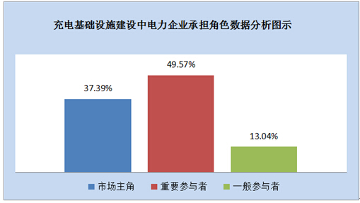 在電動(dòng)汽車基礎(chǔ)設(shè)施建設(shè)領(lǐng)域,電力企業(yè)與社會(huì)資本合作大幕已經(jīng)開(kāi)啟,如何進(jìn)一步深入,對(duì)電動(dòng)汽車產(chǎn)業(yè)未來(lái)發(fā)展將起著重要的作用。調(diào)查數(shù)據(jù)顯示,在充電樁建設(shè)中,認(rèn)為電力企業(yè)是主角的占到了37.39%,認(rèn)為是重要角色的占比為49.57%;認(rèn)為是一般參與者的為13.04%。